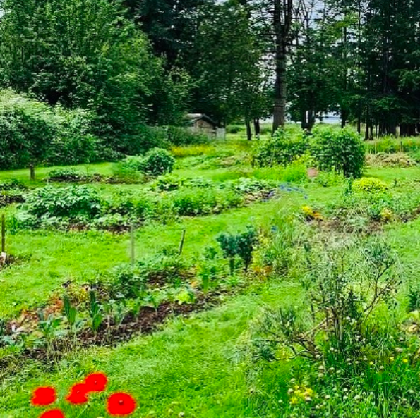 A thriving garden space where community members grow fresh produce and beautiful flowers together.